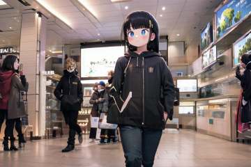 best quality, ultra-detailed, illustration,umedabm, scenery, 6+boys, bag, multiple boys, pants, multiple girls, walking, hood, black hair, indoors, ceiling, ceiling light <lora:umeda_bigman_SD15_V1:1>
