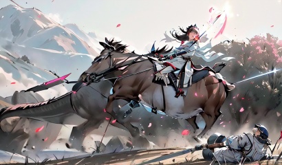knife, polearm, sheath, gloves, shield, spear, bow \(weapon\), arrow \(projectile\), flag, riding, horse, Dragon,  soldier, horseback
