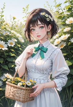 a basket with white daisies hanging, in the style of photo realistic hyperbole, green, floralpunk, oshare kei, light white and light green, amedee ozenfant, photo realistic techniques