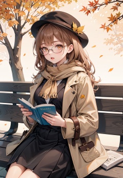 Falling leaves in autumn, girl with middle breasts, sitting on a bench, brown orange hair, orange eyes, with a long brown scarf around her neck, wearing a pair of glasses, holding a book in her hand, carefully reading, wearing a brown coat and a hat