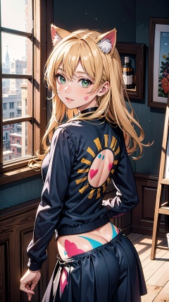 (masterpiece, best quality, high resolution), Beautiful Nose, perfect eyes, perfect face, beautiful body, alluring, wallpaper, perfect lighting, Colorful,ultra highres, photography, 8K, HDR, detailed, 1 girl,  <lora:PaintOnBody32:1>, (body paint:1.3),  long blond hair, green eyes, cat ears, T-shirt, long sleeves, skirt, (stand back to the viewer:1.6), On the windowsill