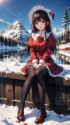 masterpiece, best quality, winter, snow field, 1girl, bangs, blue eyes, blunt bangs, bonnet, brown footwear, brown hair, dress, frills, fruit, full body, hat, long hair, long sleeves, looking at viewer, pantyhose, purple dress, red flower, red rose, rose, shoes, sitting, solo, sky, sun, mountain, forest, lake,