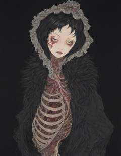 japanese line art ,a mature woman wearing a black large fur coat with skeletal hands, flesh of her cheek missing exposing buccinator muscle and mandible bone , dripping blood, skeletal figures, gore, (aged black background:1.2) , weathered canvas and brushstroke , (intricate eyeball pattern background:1) , , bad quality , low res, , in the style of takato yamamoto unfinished, ugly, <lora:takma2:1.2>
