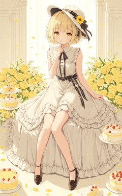 (masterpiece),(best quality),1girl, solo, dress, hat, yellow eyes, short hair, food, blonde hair, finger to mouth, flower, looking at viewer, ribbon, cake, shoes, sitting