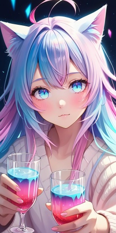 Best quality,masterpiece,cowboy shot,masterpiece,Splash color,soft lighting,(cocktail glass),1girl,solo,cat ears,multicolored hair,((gradient hair), white+(blue)+(pink:0.5) hair//),very long hair,messy hair,bangs,ahoge,((gradient eyes), pink+light_blue eyes//),slit pupils,glowing eyes,1fang,white sweater,