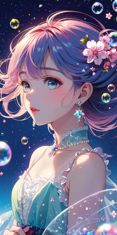 Best quality,masterpiece,(ultra-detailed), (illustration), 1girl, mixed-blood, stars in the eyes, cherry blossoms, messy floating hair, crystal earrings, colored inner hair, Starry sky adorns hair, (colorful Bubble), (pearl), (Galaxy), depth of field, upper body, lace-trimmed dress