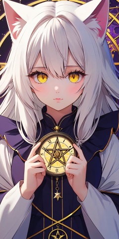 Best quality,masterpiece,{1girl},Amazing,beautifuldetailedeyes,finelydetail,Depthoffield,extremelydetailedCG,original,extremelydetailedwallpaper,white_hair,magic_circle,cat_ears,long_hair,white_hair/yellow_eyes,wand,pentagram,clock,{masterpiece},{bestquality},{1girl},Amazing,beautifuldetailedeyes,finelydetail,Depthoffield,extremelydetailedCG,original,extremelydetailedwallpaper,white_hair,