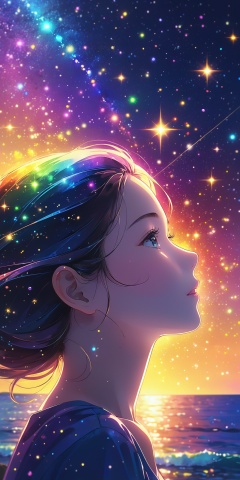 Best quality,masterpiece,1 girl,closeup,portrait,upper body,left,face from side,on the sea,(under the starry sky:1.1),the sea reflects the starry sky,rainbow color light reflected on the girl's face,sparkling lights,magical atmosphere,pointillism,Silhouette view,Cosmic wonders,Mysterious and colorful,nebula light,cosmic light,galactic light,Astronomical view,Macroscopic perspective,perspective view,masterpiece,