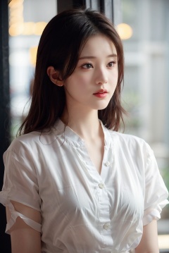 full body,masterpiece,realistic,HDR,UHD,8K,best quality,looking at viewer,masterpiece,Highly detailed,asian appearance,1girl,(round face:1.4),1girl,solo,blurry background,blurry,brown eyes,black hair,lips,shirt,realistic,white shirt,nose,parted lips,depth of field,brown hair,looking away,short hair,extremely rich skin details,Fair skin(Fair, smooth, with visible veins on the skin),delicate face,double eyelid,loveliness,snake_pupils,bright_pupils,detailed pale skin,Extremely clear skin texture,professional photography,top photography,fair_skin,Exquisite visuals,(supermodel:1.4),<lora:zhaolusi:0.7>,