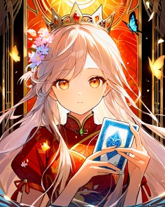 (((masterpiece))),((the best quality, super fine illustrations, beautiful and delicate water)),Depth of field,fine 8KCG wallpapers,( delicate light),((cinematic lighting)),(portrait),Portrait lens,(((Alphonse Mucha))),((Fantasy style)),((shine)),(((Tarot card)))(young girl),(((China_Cheongsam))),(delicate eyelash),((cute anime face)),(extremely delicate and beautiful),(hair_flower),(Gem),(crystal),((colored inner long hair)),(multicolored),(beautiful detailed face ),((( detailed long hair ))),floating long hair,gradient hair,(lace),(ribbon),((crown)),(detailed cloth)((Butterfly)),(detailed Butterfly),(multicolored Butterfly),(neon palette),((detailed flowers)),((multicolored flowers)),(flowers_Surrounded),(Butterfly_Surrounded)(((Flowers fill the screen))),((Fill the screen)),, masterpiece, best quality