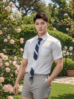 masterpiece,1 boy,Young,Handsome,Look at me,Short hair,Tea hair,Students,White shirt,Striped tie,Gray shorts,Stand,Outdoor,Garden,Peach tree,Flying petals,Light and shadow,HDR,textured skin,super detail,best quality,