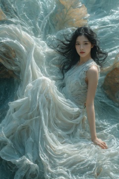 sdmai,bohenv,Lotus,lotus pond,water drops,1girl,realistic,solo,jewelry,black hair,earrings,long hair,dress,looking at viewer,white dress,breasts,