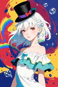 (colorful background:1.2),(surrounded by colorful splashes),colorful bubbles,(bright color),flat color,(floating:1.2),(rainbow color:1.3),(color ink:0.8), (ink splashing:0.8), (color splashing:1.2),