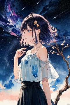 Extremely and detailed Starry sky  background,wind,nebula-background,fantastic-wind nebula, (branch:1.15),in flower blossoms,