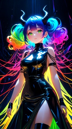 frilly hairstyle, latex dress, torso, body, 8k, ultra-detailed, highres, rainbow skin, shattered glass effect, (best quality, masterpiece:1.2), (deformad neon light:1.3), soft particles of fractal fire, volumetric lighting, (masterpiece, best quality), 1girl, intricate details, 8k, artstation, wallpaper, official art, splash art, sharp focus, dark atmosphere, black coat, black dress, cartoon for adults, white sleeves, sleeves past finger, sleeves past wrists, horns, (cottagetore), (geometric:1.2), futurism, impressionist, detailed, majestic, breathtaking, (suggestive:1.3), (depressing:1.3), (cute:1.2), enticing, (irresistible:1.3), disturbing, fascinating, (magnetic:1.2), (green), latex clothing, suggestive position, latex costume, Depth of field, vivid color, rainbow bloody veins growing and intertwining out of the darkness, (nailed wire), oozing thick blue blood, sharp neon, veins growing and pumping blood, vascular networks growing, under water