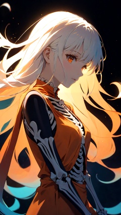 Masterpiece,high quality,(solo:1.2),((1girl)),(((human skeleton | girl))),(white hair:0.3),cinematic light,orange clothes,detailed environment,1girl,solo,reflection,upper body,sunlight,(White hair:1.2),very long hair,wide sleeves,Deep photo,depth of field,shadows,messy hair,seductive silhouette play,dark,nighttime,dark photo,grainy,dimly lit,bangs,Cinematic Lighting,Tyndall effect,abstract background,vibrant colors,modern style,artistic,dynamic composition,unique patterns,bold textures,colorful,lively,youthful,energetic,creative,expressive,stylish,trendy,white_marble_glowing_skin,