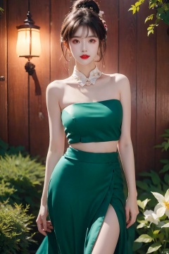 1girl, bare shoulders, black hair, breasts,Wooden wall, bush,Dai ethnic skirt, earrings, flower, garden,Chinese Dai ethnic clothing,Diagonal draped light gauze skirt, strapless dress, grass, hair bun, jewelry, makeup, outdoors, plant, red lips, solo, standing, depth of field