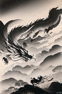 (best quality, super detailed,actual:1.37), ink dragon, monochrome,within the mist, expression,claws,auspicious clouds,full body, ink landscape,delicate eyes,peaceful atmosphere,ink strokes,ethereal, sublime, flowing, contrast of light and shadow,black and white tones, gradients,traditional Chinese painting,dream atmosphere,traditional painting techniques, beauty, scale, entangled, exist,traditional aesthetics,graceful movements,dynamic ink line,drama composition,Immortal Mothan, Charming ink texture, expressive ink strokes,mysterious aura,Intricate ink details,poetic depth,Lively brushstrokes,ink mix. Chinese Dragon