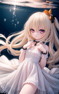 very long hair,cowboy shot,4349,1girl,dress,solo,ribbon,white_dress,underwater,blonde_hair,hair_ribbon,looking_at_viewer,orange_ribbon,orange_eyes,holding,bubble,bangs,wrist_cuffs,air_bubble,blush,hair_between_eyes,