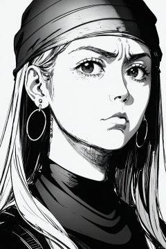 1girl, solo, long hair, looking at viewer, 1boy, jewelry, closed mouth, monochrome, greyscale, male focus, earrings, frown, parody, portrait, hoop earrings, bandana,kp