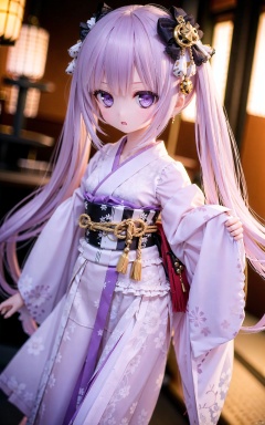 very long hair,cowboy shot,4349,,1girl,solo,kimono,japanese_clothes,looking_at_viewer,bow,bangs,holding,purple_eyes,hair_ornament,wind_chime,sash,obi,hair_bow,multicolored_hair,purple_hair,long_sleeves,twintails,wide_sleeves,long_hair,purple_bow,purple_kimono,ribbon,frills,