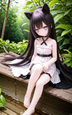very long hair,cowboy shot,4349,1girl,animal_ears,solo,tail,dress,sitting,barefoot,black_hair,looking_at_viewer,black_dress,water,plant,outdoors,hair_bun,bare_shoulders,soaking_feet,bangs,long_hair,closed_mouth,grey_eyes,