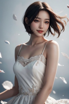 extremely detailed, realistic, 1girl, looking at viewer, side, beauty, floating petals, blurry background, HYD, Split Lighting, deep shadow, cowboy shot, white dress, floating petals, Kpop_idol face, short hair, jitome, calm smile,<lora:EMS-276654-EMS:0.800000>