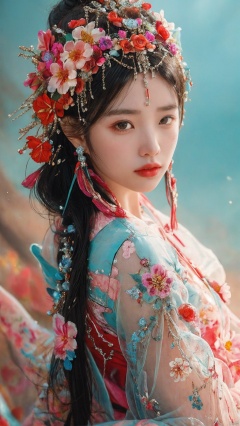 sdmai,chaziyanhong,, 1girl, hair ornament, solo, realistic, flower, jewelry, hair flower, earrings, looking at viewer, long hair, black hair, blurry, lips