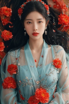 sdmai,chaziyanhong,, 1girl, flower, solo, black hair, long hair, looking at viewer, realistic, jewelry, red flower, parted lips, earrings, lips, lying, water, petals