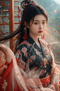 sdmai,chaziyanhong,, 1girl, solo, realistic, chinese clothes, long hair, jewelry, petals, earrings, hair ornament, upper body, looking at viewer, hanfu, black hair