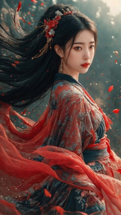 sdmai,chaziyanhong,, 1girl, jewelry, solo, hair ornament, long hair, earrings, black hair, flower, chinese clothes, petals, upper body, hair flower, realistic, shawl