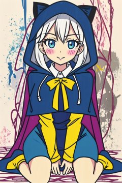 1girl, solo, long hair, looking at viewer, blush, smile, bangs, blue eyes, shirt, long sleeves, dress, ribbon, hair between eyes, sitting, very long hair, closed mouth, full body, white shirt, flower, white hair, barefoot, striped, collared shirt, hood, water, cape, petals, black ribbon, neck ribbon, blue dress, wariza, white flower, cloak, vertical stripes, hood up, yellow flower, striped dress, hooded cloak, vertical-striped dress, hooded capeLines,colored spray paint,colored ink drops,<lora:蔚蓝Blue水彩泼墨(3):0.8>,