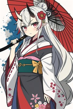 1girl, solo, long hair, looking at viewer, bangs, hair ornament, red eyes, long sleeves, holding, weapon, flower, white hair, grey hair, red hair, multicolored hair, frills, parted lips, japanese clothes, horns, sword, virtual youtuber, hair flower, wide sleeves, kimono, off shoulder, hair bun, holding weapon, arm up, streaked hair, sash, bell, gradient hair, umbrella, holding sword, obi, floral print, katana, frilled sleeves, red flower, sheath, tassel, oni horns, oni, holding umbrella, oil-paper umbrella, black kimono, spider lily, nakiri ayameLines,colored spray paint,colored ink drops,<lora:蔚蓝Blue水彩泼墨(2):0.7>,