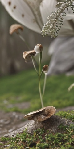 flower, outdoors, blurry, no humans, depth of field, blurry background, grass, plant, scenery, mushroom