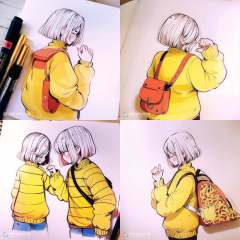 <lora:游戏图标研究所插画:1>g55_\(juse\), a drawing of a woman in a yellow jacket and a pencil and a plant on a table with a marker, 1girl, solo, blush, short_hair, bangs, skirt, long_sleeves, white_background, closed_eyes, white_hair, cowboy_shot, hand_up, bag, sweater, profile, leaf, traditional_media, backpack, yellow_shirt, yellow_sweater