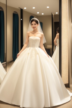 bride, wedding dress, white dress, lace details, Asian woman, bridal shop, smiling, happy, veil, strapless dress, elegant, full-length gown, fitting session, mirrors, soft lighting, indoor setting, standing pose, high-waist dress, floor-length veil, reflection, feminine, joyous expression, anticipation, fashion, luxury, style, no visible brand., masterpiece,best quality,ultra-detailed,