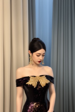 Asian woman, elegant, off-the-shoulder dress, sequined, black with gold accents, formal attire, indoor setting, curtain background, soft lighting, neutral makeup, red lipstick, hair updo with accessory, long earrings, poised expression, looking down, blurred background, portrait, vertical composition, high-quality image, soft focus, photography, fashion., masterpiece,best quality,ultra-detailed,