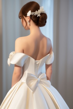 bride, back view, white wedding dress, off-shoulder gown, elegant updo hairstyle, white floral hairpiece, satin bow, dangling crystal accessory, neutral background, soft lighting, shadow profile, brown hair, skin imperfections, natural makeup, masterpiece,best quality,ultra-detailed,