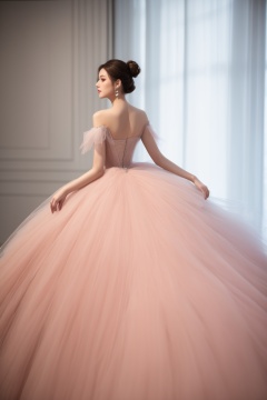 woman, profile view, elegant dress, soft lighting, ethereal, pastel colors, tulle fabric, flowing gown, light pink, haute couture, fashion photography, high bun hairstyle, delicate, graceful pose, dreamy atmosphere, light diffusion, wedding fashion, subtle makeup, sheer fabric, masterpiece,best quality,ultra-detailed,