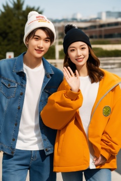 young woman,young man,playful pose,outdoor setting,urban backdrop,casual attire,denim jeans,white blouse,beanie hat,smiling,waving hand,sunny day,street fashion,fashion photography,youth culture,lifestyle,clear sky,warm colors,depth of field effect,fashion magazine layout,text overlay,Asian ethnicity,contemporary style,natural light,soft focus background,basketball hoop in background,friendship.,, masterpiece,best quality,ultra-detailed,