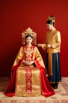 Asian woman, traditional Chinese wedding dress, red gold embroidery, seated, headdress, Chinese bridal crown, tassel earrings, intricate makeup, groom assisting, black traditional attire, groom hat, red backdrop, studio portrait, standing pose, serene expression, cultural attire, ornate patterns, ceremonial outfit, side view, male assistant, elaborate costume, hand gesture, carpet floor, cultural representation, elaborate hairdo, historical theme, soft lighting, rich colors., masterpiece,best quality,ultra-detailed,