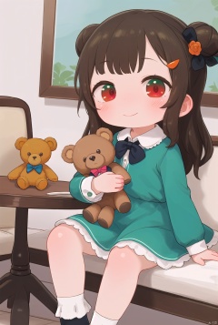 masterpiece), (best quality), loli,1girl,loli,smile,blush,stuffed animal,stuffed toy,solo,dress,long hair,sitting,looking at viewer,teddy bear,holding stuffed toy,long sleeves,hair ornament,hair bun,bow,green dress,orange bow,plaid,blush,socks,frills,bangs,closed mouth,holding,red eyes,orange bowtie,flower,feet out of frame,ribbon,hair ribbon,single side bun,green bow,brown hair,table,blanket,black ribbon,hairclip,collar,bowtie,