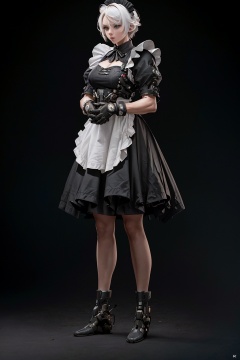 1girl,solo,(front view:1.5),looking_at_viewer,white hair,blue_eyes,hair_between_eyes,(full body:1.5),(full_shot:1.5),(standing:1.5),(clenched hands:1.5),(gloves:1.5),skirt,(maid:1.5),outdoors,park,<lora:kp_赛博朋克V1:0.8>, kp,cyborg,cyberpunk,, masterpiece, best quality, unity 8k wallpaper