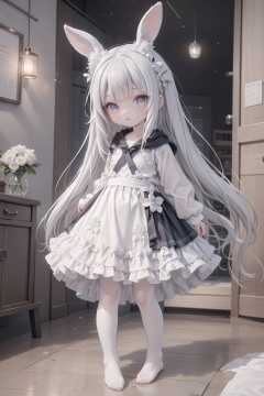 ray tracing,(best quality),((masterpiece)),(highres),original,extremely detailed 8K wallpaper,(an extremely delicate and beautiful),incredibly absurdres,colorful,intricate detail,artbook,(((Frostnova(Arknights)))),((rabbit ears)),((hair between eyes)),(((eyes visible through hair))),cinematic angle,intense angle(depth of field),((There is a scar on the nose bridge)),Grey eyes,(((blunt bangs))),parted bangs,(messy hair),((long hair)),((hair spread out)),(floating hair),((hair over one eye)),((grey hair)),(((snowstorm))),(Orange armband),((white windbreaker)),((Cape hood)),hairclip,belt,thigh strap,Tactical gloves,walking,light smile,(((cross- laced footwear))),(loli:1.5),(5yo:1.5),(very_long_hair,:1.3),