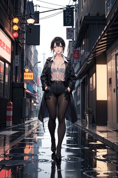 (UHQ, 8k resolution), creates seductive images of sexy women in rain-soaked urban environments.In the photo, she is standing under dim streetlights in a deserted alley in the pouring rain.She wore a see-through black lace bodysuit with her hands in her pockets, outlining her curves, leaving her trench coat unbuttoned and her raincoat flapping in the wind.Her long, wet hair hung down her back, shining in the dim light.The road was smooth, and the puddles reflected the neon lights overhead, casting an ethereal glow around her... ((poakl)).