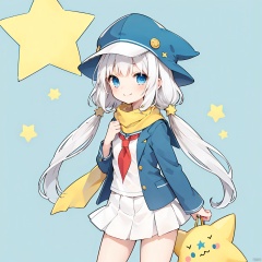 masterpiece, bestquality, Jirachi personified, 1girl, solo, long hair, smile, blue eyes, hat, twintails, white hair, star \(symbol\), scarf, (school uniform:1.3),