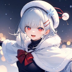 nai3, 1girl,white hair,red eyes,portrait,winter, snowflakes,1girl, solo, hair_ornament,hairclip, smile, open_mouth, looking_at_viewer, blush, {sweater}, hat, :d, long_sleeves,sweater, {skirt}, {{fur_trim}}, capelet, outstretched_arms, bangs, teeth, plaid, white_headwear, upper_body, beret, blue_capelet, fur-trimmed_capelet, bow, turtleneck, {jacket, pom_pom_\(clothes\)}