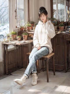1girl,asian, solo, black hair, sitting, pants, indoors, hood, hair bun, sweater, cup, window, hoodie, phone, table, single hair bun, white footwear, hood down, plant, denim, reflection, head rest, jeans, mirror, realistic, red lips, potted plant