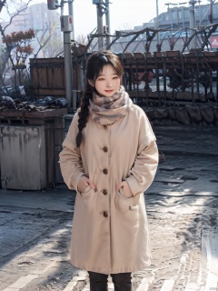 1girl, asian,smile,solo, long hair, looking at viewer, black hair, long sleeves, standing, braid, outdoors, parted lips, striped, scarf, twin braids, lips, coat, sleeves past wrists, realistic, white scarf, winter clothes, photo background, train station
