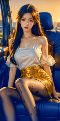 solo, black pantyhose, printed socks, business attire, ridiculous, inside the car, sitting in the car, sitting in the co-pilot, skirt, sitting, , ((poakl)), Light master, yuechan